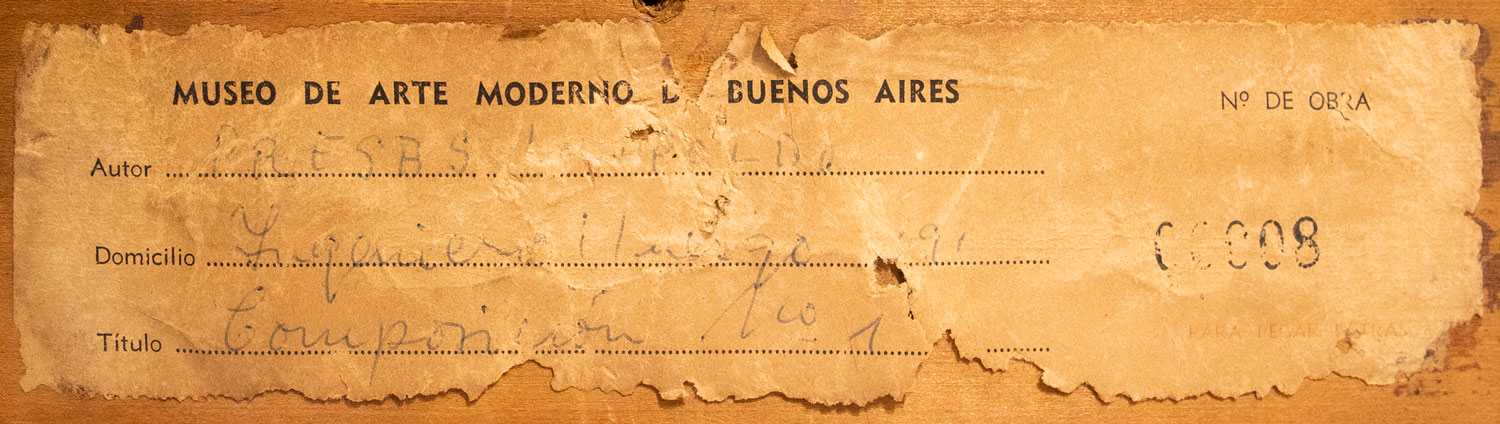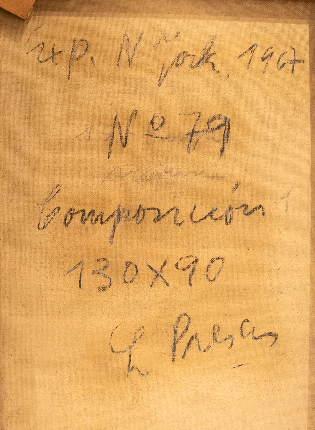 Óleo sobre tela. Firmado Presas, abajo a la derecha. Mide: 130 x 90 cm. Ref.: Al dorso, titulado, firmado, medidas, N°79 e inscripción "Exp. N. York 1967". Etiqueta del Museo de Arte Moderno de Buenos Aires (deteriorada). Expuesta en la exposición retrospectiva "Leopoldo Presas of Argentina", Gallery of Modern Art, Nueva York, 1967. Correspondiente etiqueta al dorso (deteriorada). En 1967 Leopoldo Presas realizó una importante exposición retrospectiva de 108 obras en The Gallery of Modern Art and The Hungtinton Hartford Collection en Nueva York, presentada por Rafael Squirru. Dicha galería había sido fundada en 1964 por el magnate Hungtinton Hartford con el objetivo de alojar su colección de arte moderno. Allí se exponían obras de arte que no respondían a la abstracción, en contraposición con la tendencia del MoMA que se encontraba a pocas cuadras. Durante su corta existencia de apenas cinco años, la Galería llevó adelante importantes exposiciones de artistas internacionales y retrospectivas de destacados artistas argentinos.