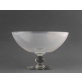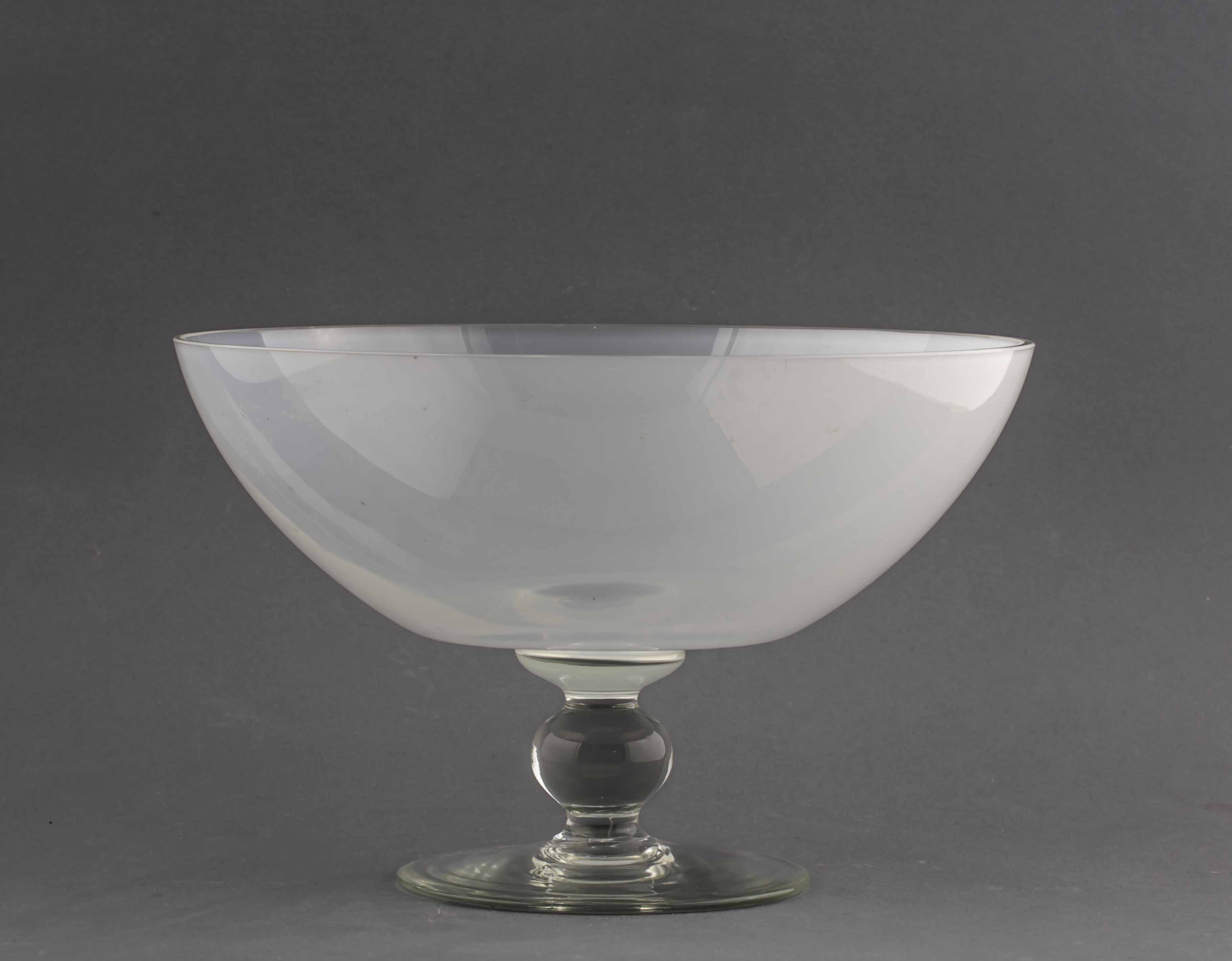 Realizado en vidrio opalinado de color blanco con fuste y base circular en vidrio neutro. Pequeña cascadura en el borde. Altura: 16,5 cm. Diámetro: 26 cm.