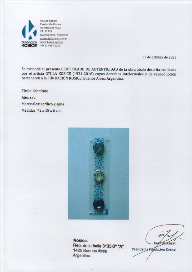 Escultura en acrílico y agua. Mide: 72 x 18 x 6 cm. Ref.: Certificado de autenticidad extendido por la Sra. Yael Barcesat, presidente de Fundación Kosice. Colección Jean and Colette Cherqui