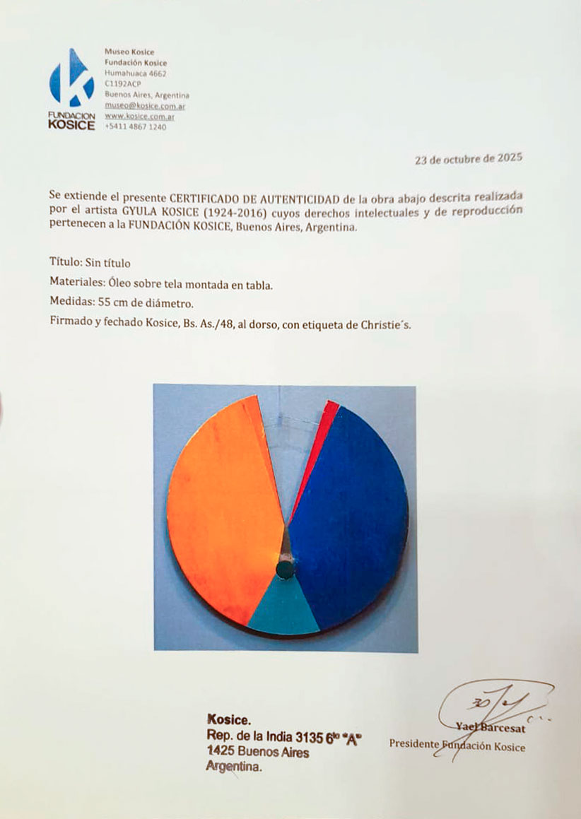 Óleo sobre tela montada en tabla. Titulado, firmado y fechado Kosice, Bs. As./48, al dorso. Diámetro: 55 cm. Ref.: Al dorso, etiqueta de Christie´s. Certificado de autenticidad extendido por la Sra. Yael Barcesat, presidente de Fundación Kosice. Colección Jean and Colette Cherqui
