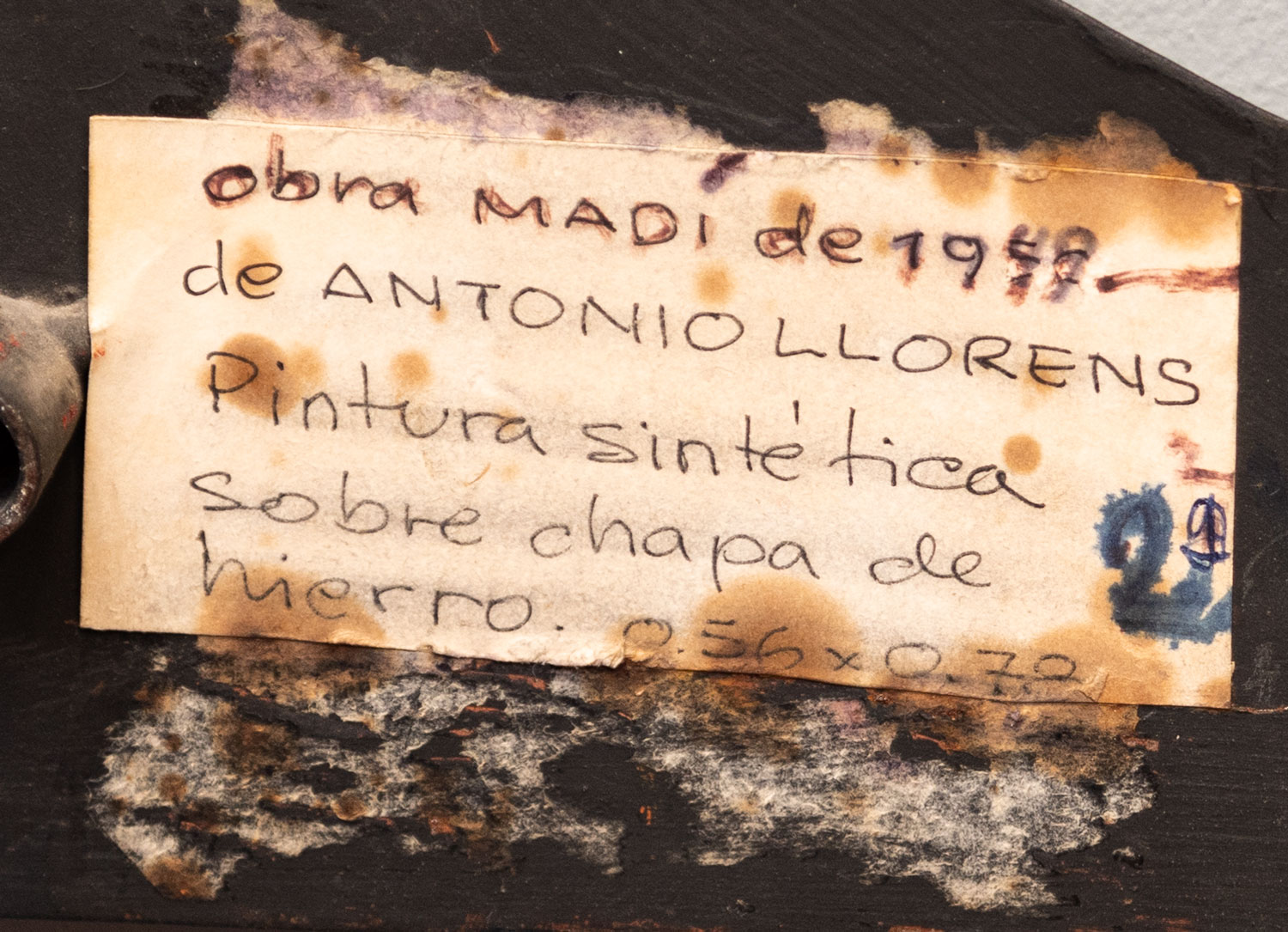Pintura sintética sobre chapa de hierro. Firmada Llorens, abajo a la derecha. Mide: 68 x 53 x 3 cm. Ref.: Al dorso, etiqueta con datos de la obra. Reproducida en el libro "Geometry Beyong Limits" Latin-American Contemporary Art from the Jean Colette Cherqui Collection, 2010, pág. 83. Colección Jean and Colette Cherqui