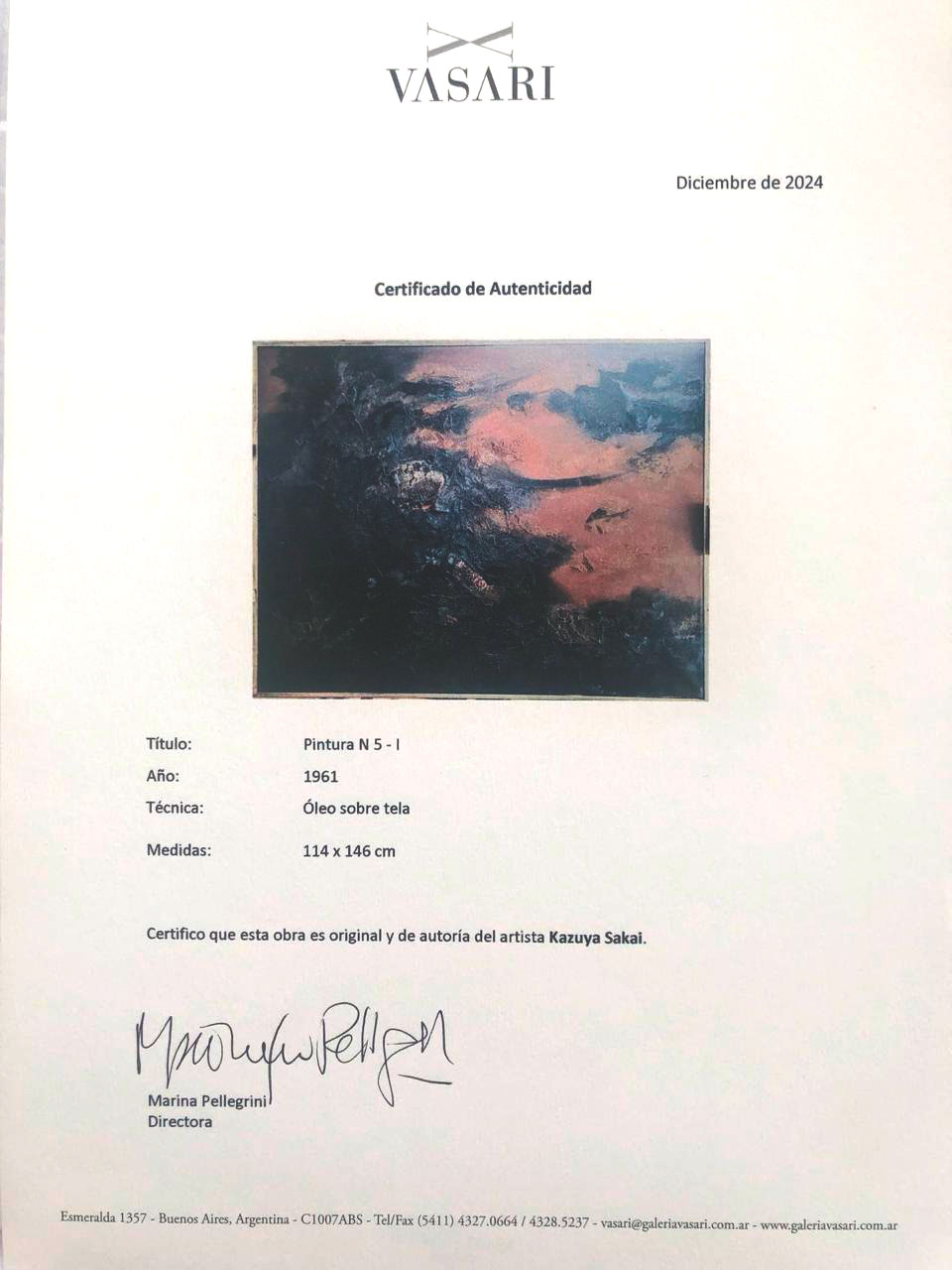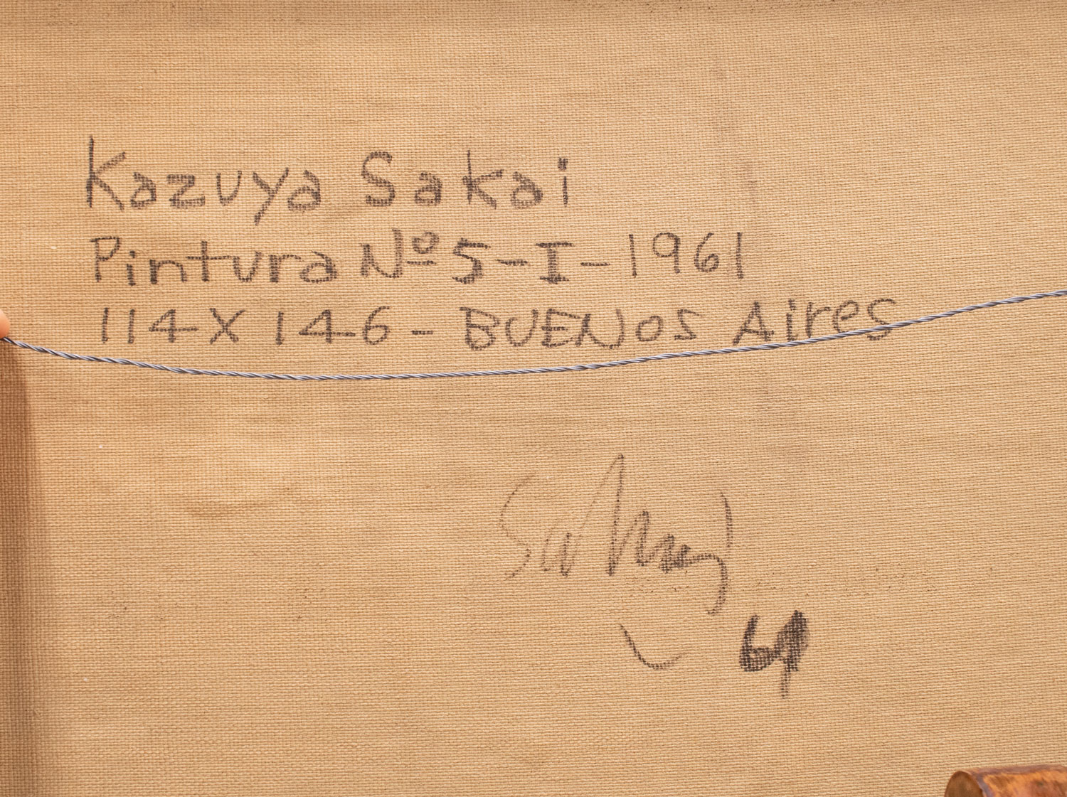 Óleo sobre tela. Firmado y fechado Sakai/61, abajo a la izquierda. Mide: 114 x 146 cm. Ref.: Al dorso, titulado, firmado, fechado y medidas. Certificado de autenticidad extendido por la Sra. Marina Pellegrini, directora de Galería Vasari.
