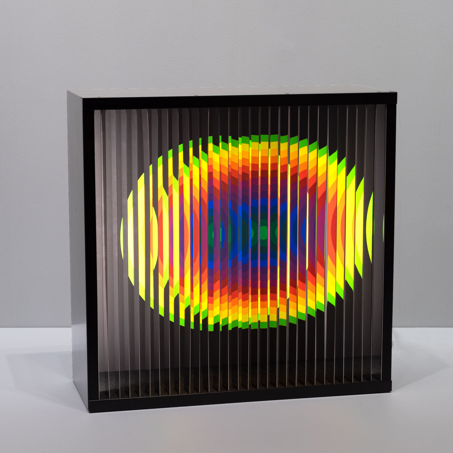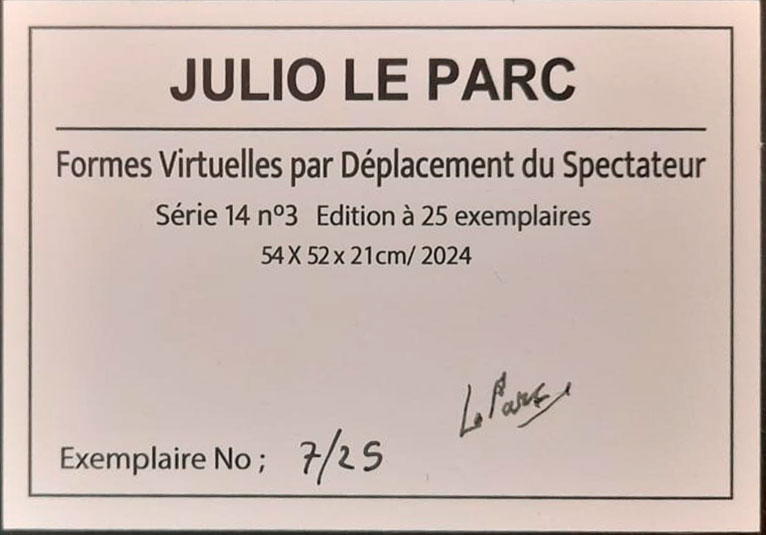 Caja con luz. Titulada, firmada Le Parc, fechada 2024 y N°7/25, al dorso sobre etiqueta. Mide: 54 x 52 x 21 cm. Ref.: Una foto del artista con otra obra de la misma serie fue publicada en la nota "Julio Le Parc, a los 97 años: “No soy fotógrafo ni artista. Solo un experimentador”", La Nación, 12 de noviembre de 2025.