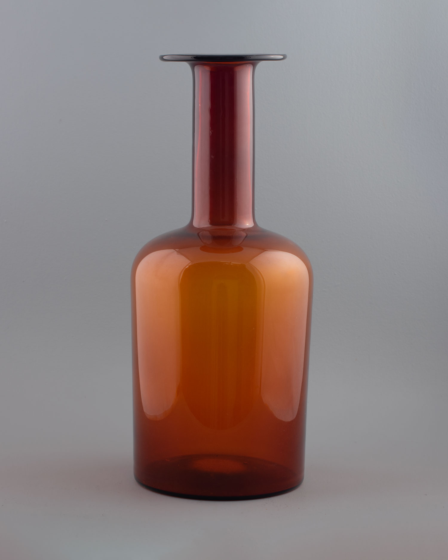 En forma de botella realizado en cristal color ámbar. Fue diseñado en 1962 para Holmegaard. Altura: 50 cm.