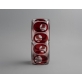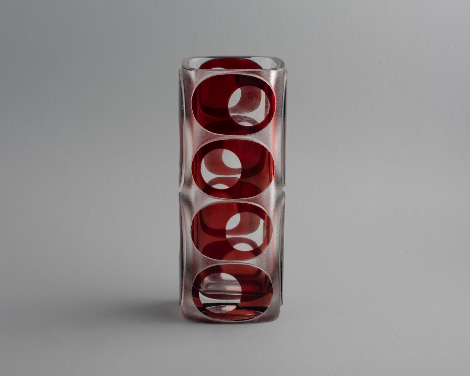 De forma cuadrangular, realizado en vidrio esmerilado con decoración de óvalos en rojo y círculos en neutro. Altura: 24,5 cm.