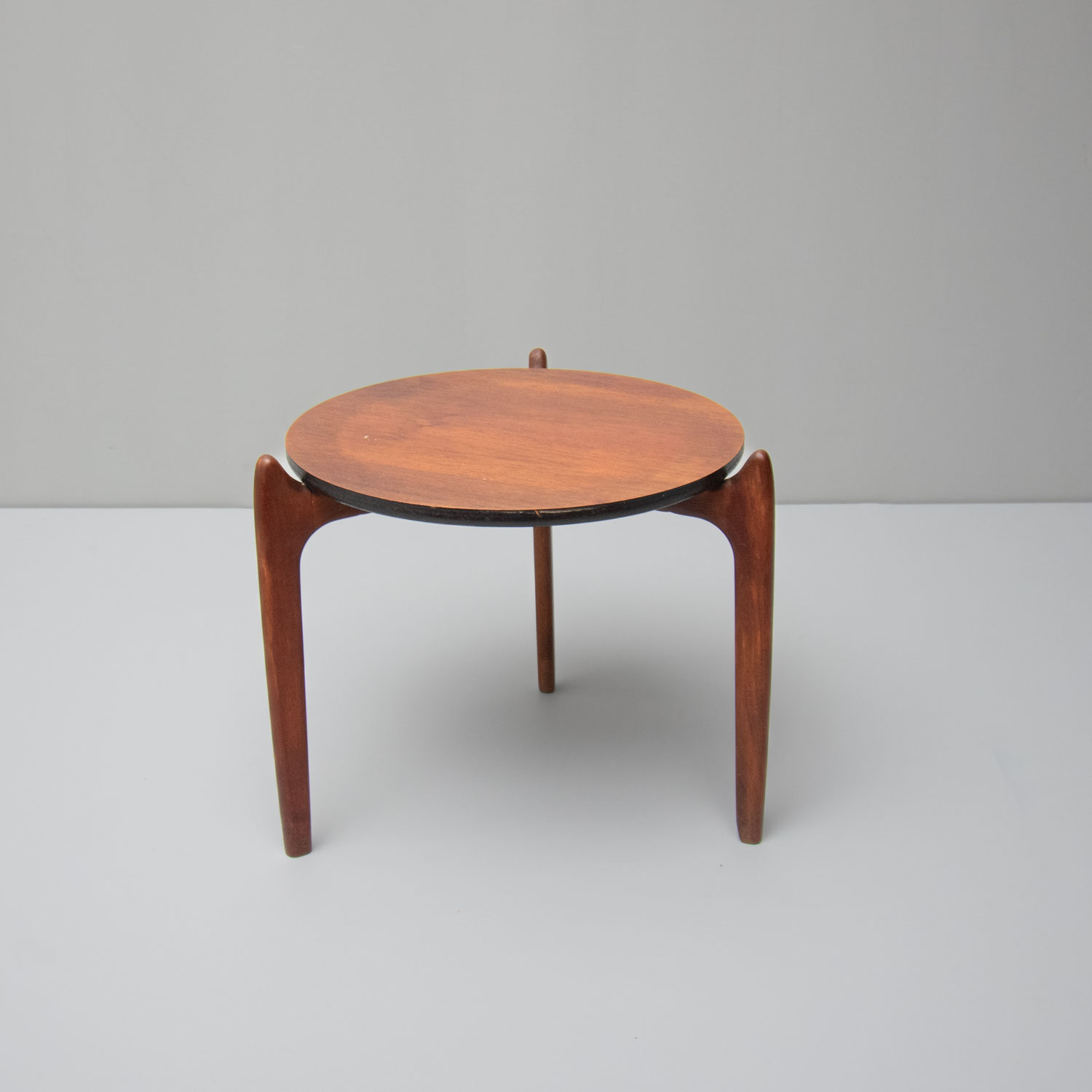 Realizada en madera de nogal, con tapa circular y base trípode cuyas patas son cónicas. Atribuida a Adrian Pearsall para Craft en 1960. Alto: 42 cm. Diámetro: 46 cm.