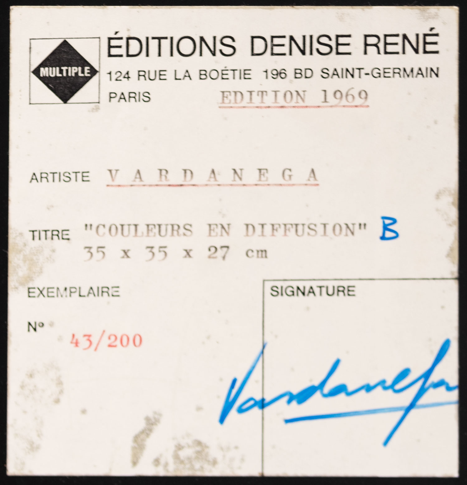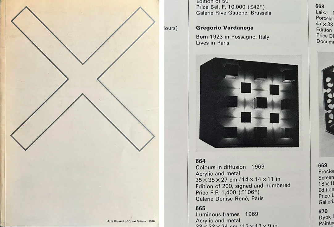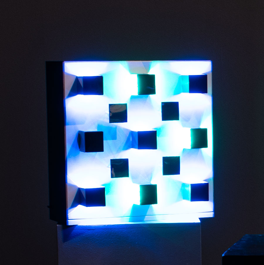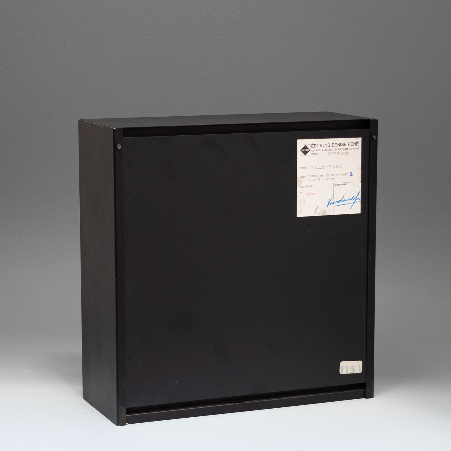 Escultura en metal con espejos, acrílicos y luz. Firmada Vardanega y N°43/200, al dorso sobre la etiqueta Mide: 35 x 35 27 cm. Ref.: Edición Denise René, 1969. Correspondiente etiqueta al dorso. Expuesta en "3 [towards infinity]: new multiple art”, Whitechapel Art Gallery y British Arts Council, 19 de noviembre de 1970 al 3 de enero de 1971, Londres. Reproducida y mencionada en lista de obras, N° 664, p. 78.