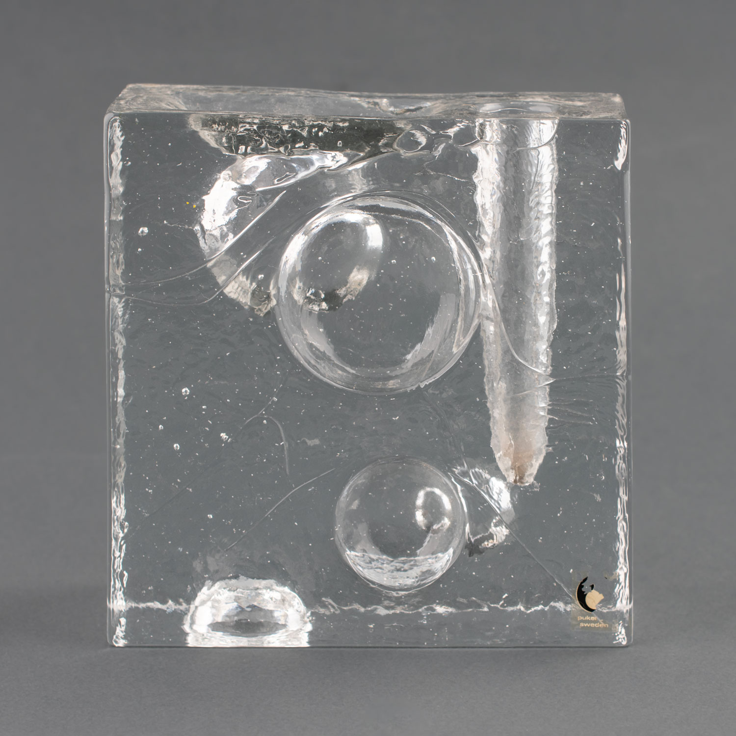 Diseñado por Uno Westerberg y fabricado por el fabricante sueco Pukeberg. De forma cuadrangular con decoración de huecos semiesféricos y concavidad en la parte superior para sostener una flor de un solo tallo o una vela delgada. Etiqueta de Pukeberg. Altura: 12,5 cm.