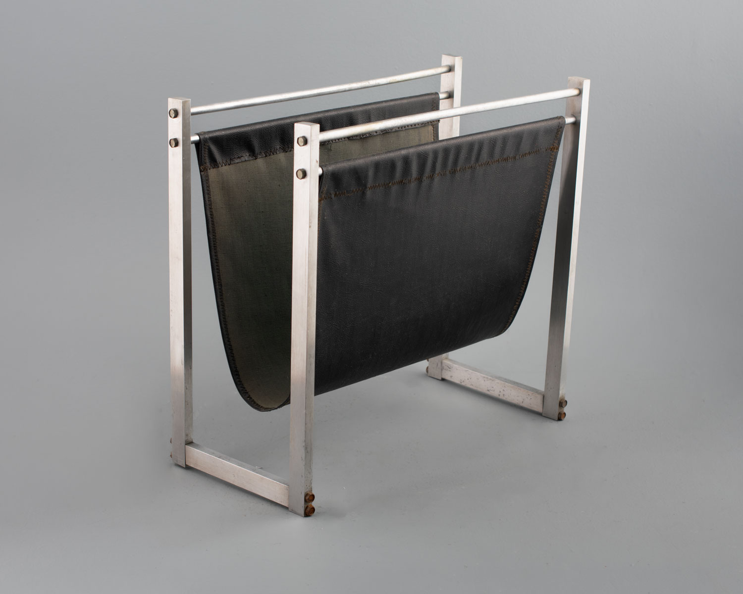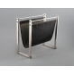 Estructura de metal que sostiene una pieza de cuero curvada, que sirve para guardar revistas. Altura: 33 cm.