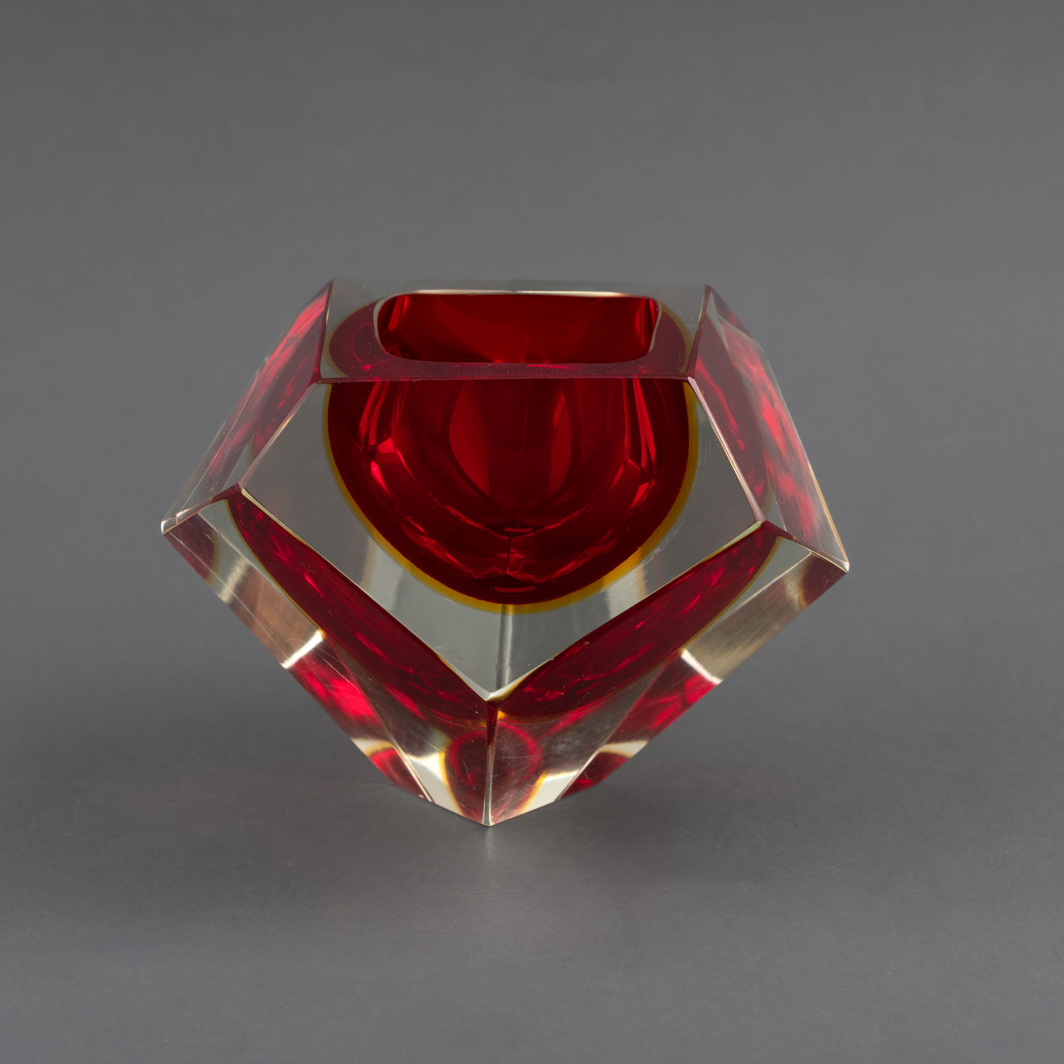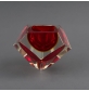 Su forma facetada en todos los lados evoca a un diamante, realizado con la técnica de sommerso en color rojo, amarillo y transparente. Atribuido a Flavio Poli en los años 60 para Seguso. Altura: 10 cm.