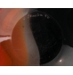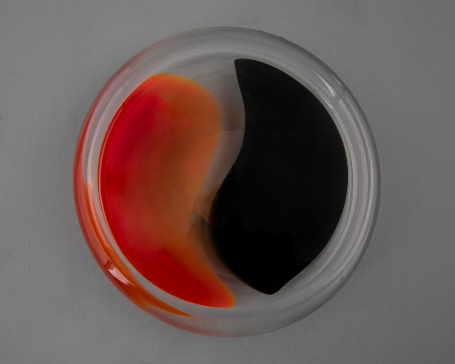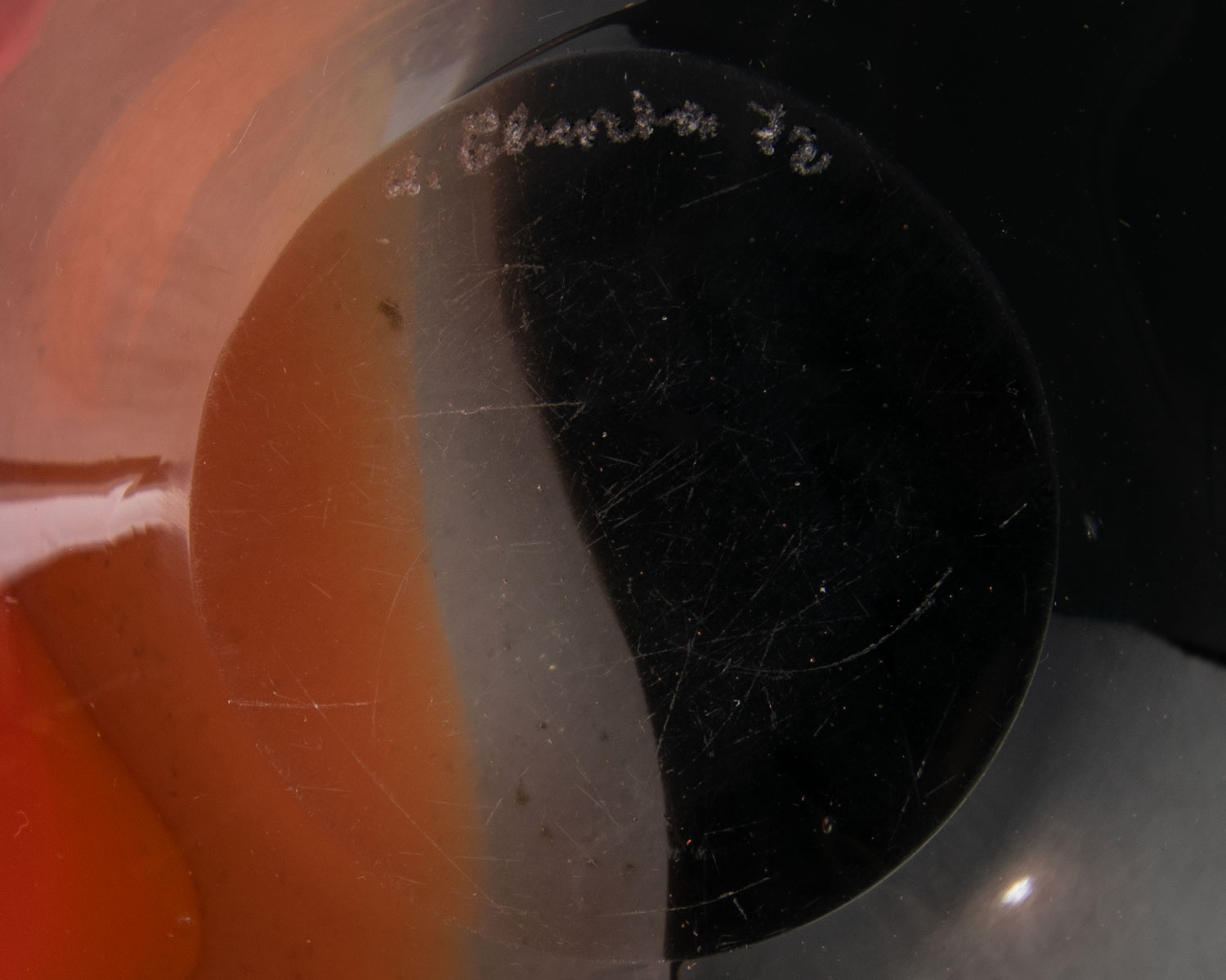 Realizado en dos colores naranja y negro encerrados en una capa exterior de vidrio transparente. Al dorso firmado A. Churba 72. Diámetro: 19 cm.