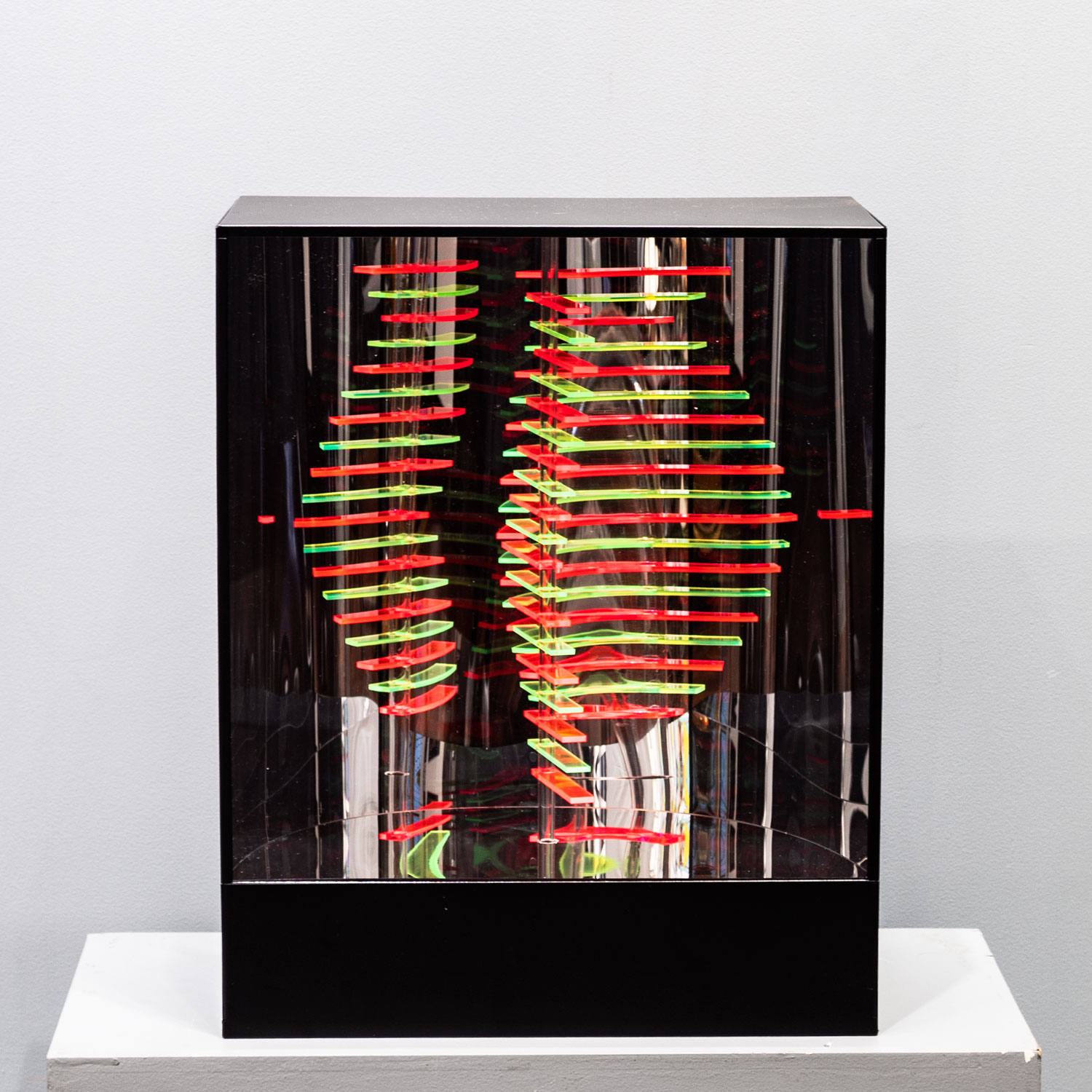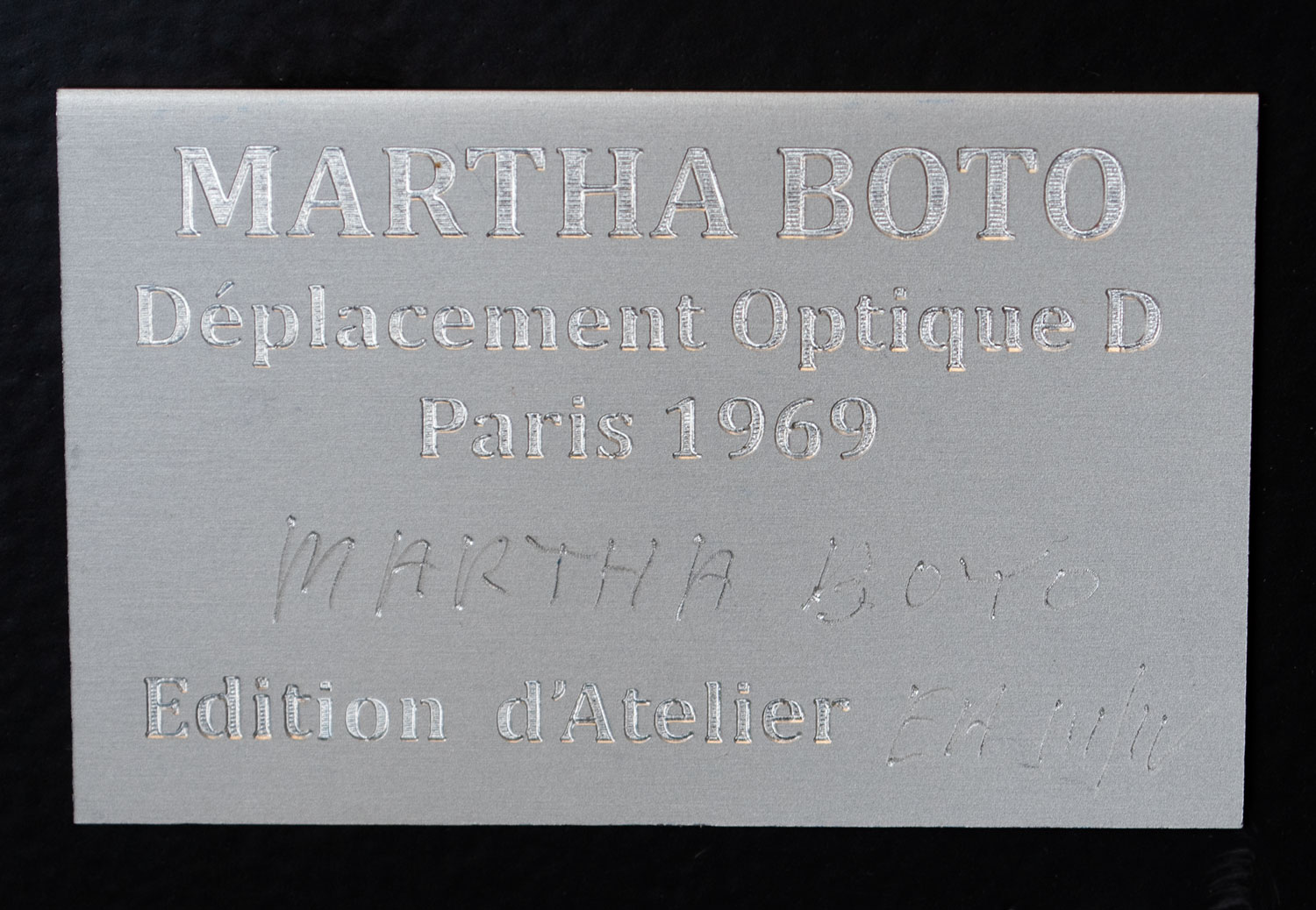 Escultura en metal y acrílico con motor. Mide: 47,5 x 22 x 38,5 cm. Ref.: Al dorso, firmada Martha Boto y Edition Atelier, III/IV. Basada en una obra de 1969.