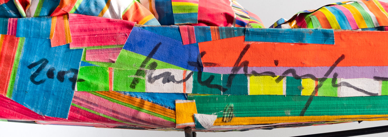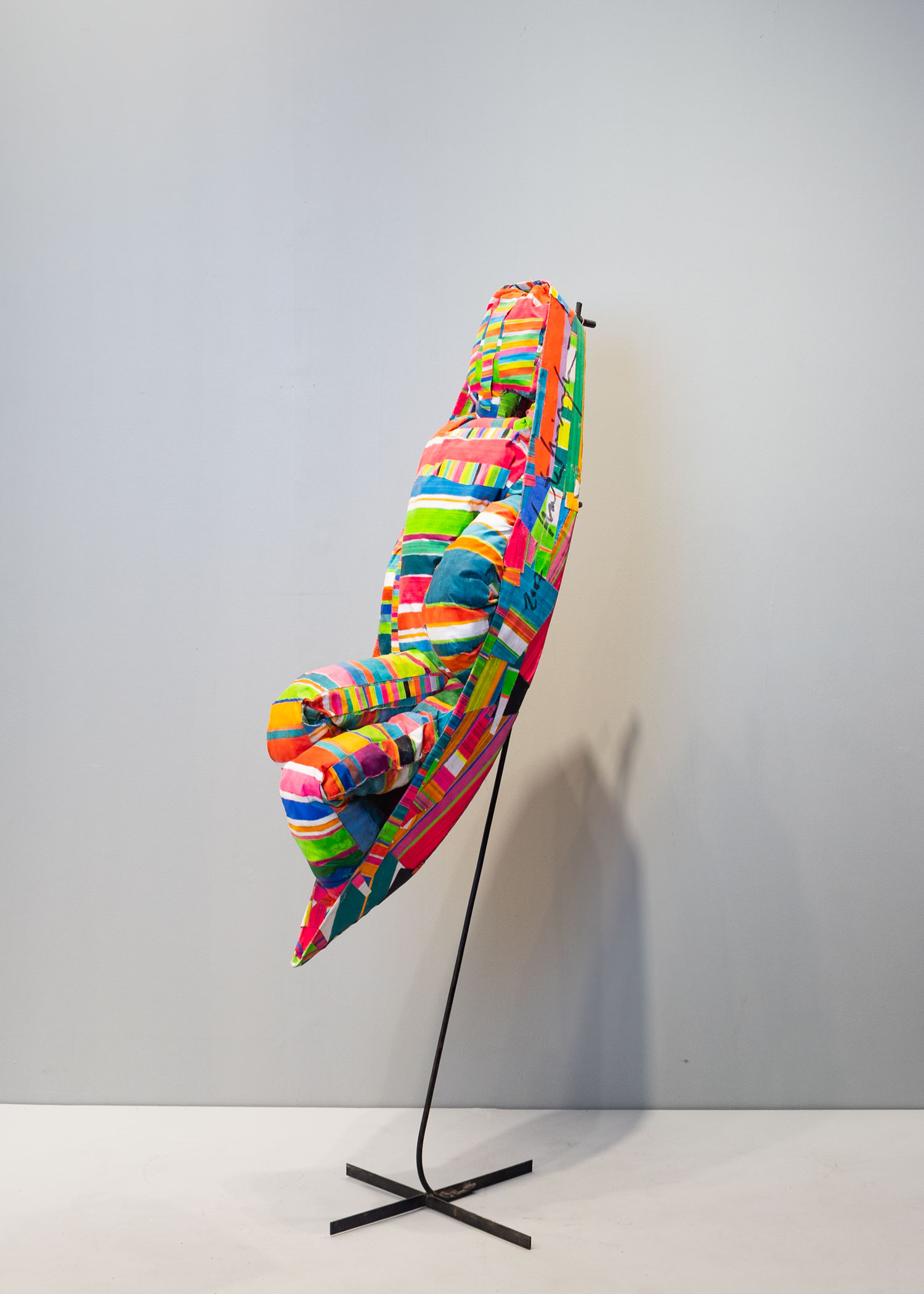 Escultura con telas y acrílico. Firmada y fechada Marta Minujin, 2007, en el lateral derecho. Mide: 122 x 30 x 35 cm. Ref.: Apoya sobre base de metal. Altura con base: 155 cm.