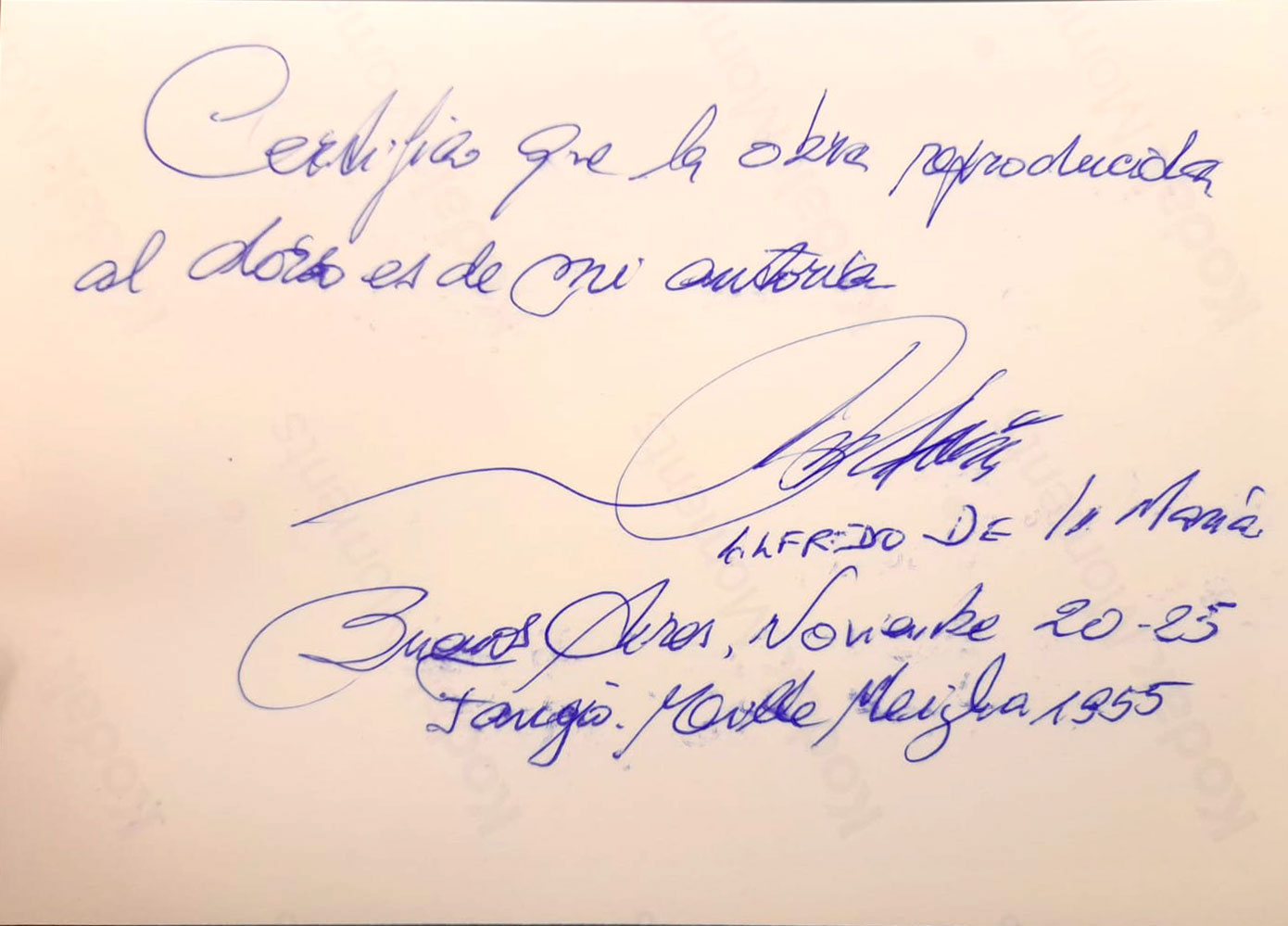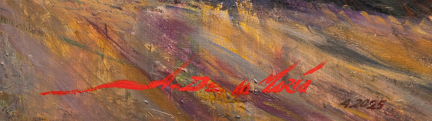 Óleo sobre tela. Firmado y fechado De la María, 04/2025, abajo a la izquierda. Mide: 86 x 130 cm. Ref.: Durante 30 años, la Mille Miglia fue una de las carreras más prestigiosas del panorama internacional automovilístico y la más importante de Italia. Un rally de velocidad por carreteras, en el que había que cubrir la distancia de mil millas dando una vuelta por la península itálica. En la obra aparece Fangio en primer plano, corriendo para Mercedes, con el N°658. Detrás de él, Castelloti por Ferrari, con el N°723. Foto certificado de autenticidad extendido por el artista, con fecha noviembre 2025.