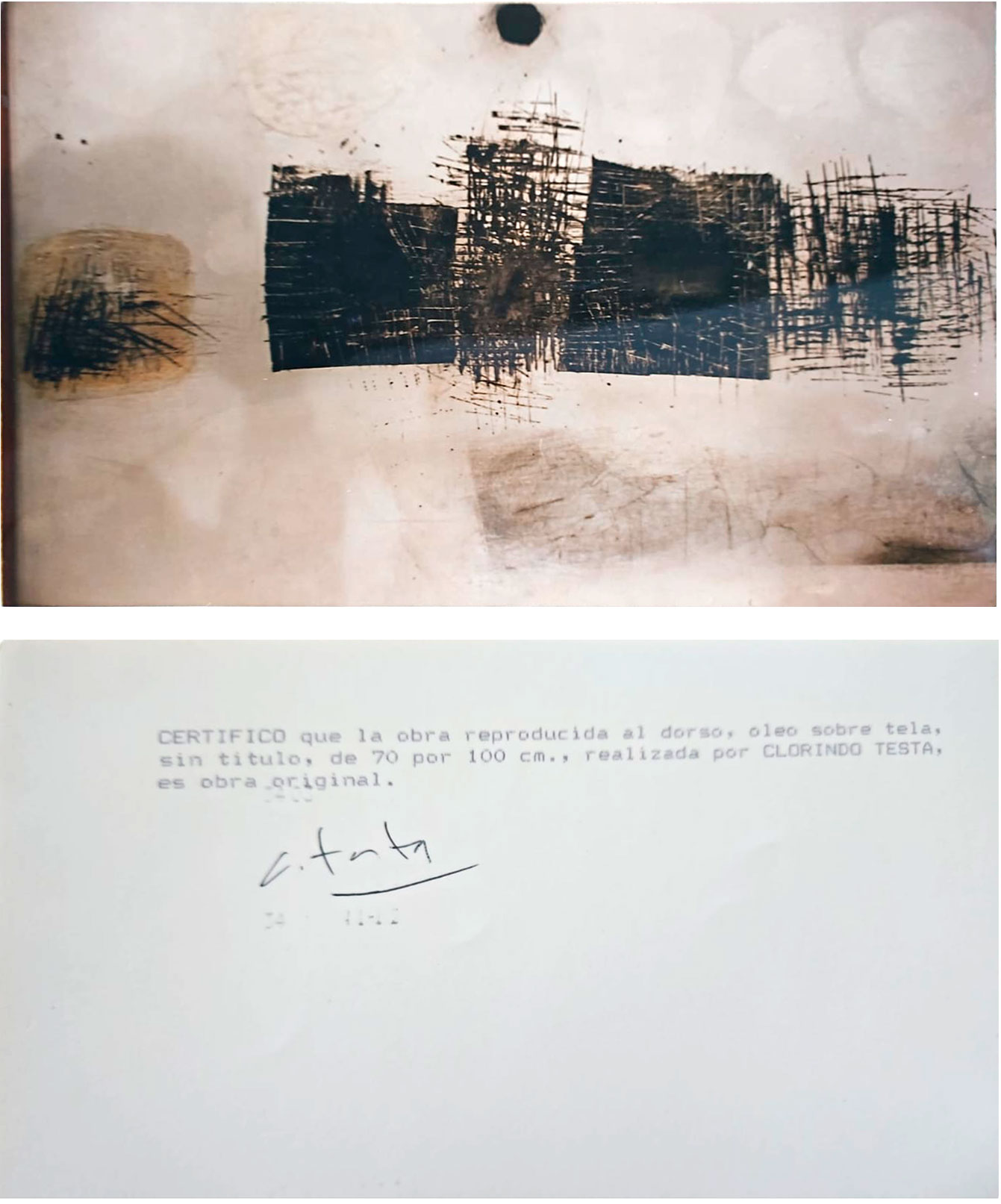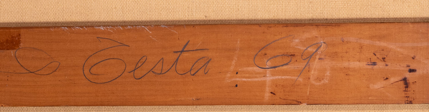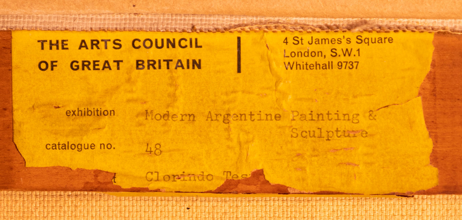 Óleo sobre tela. Mide: 70 x 100 cm. Ref.: 1957. Al dorso, etiqueta con datos de la obra. Etiqueta de The Arts Council of Great Britain. Foto certificado de autenticidad extendido por el artista. Agradecemos a la Fundación Clorindo Testa, por la consideración y verificación de la obra.