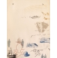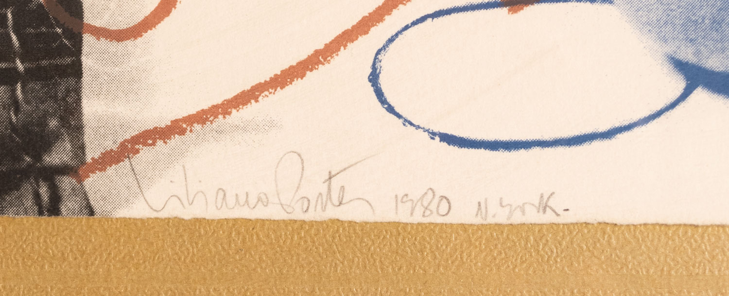 Serigrafia intervenida. Pieza Unica. Firmada y fechada, Liliana Porter, NY 1980, abajo a la izquierda. Mide: 76 x 57 cm. Ref.: Las imágenes presentes en la obra son elementos de su vocabulario plástico que utilizó en diversas oportunidades, impresas sobre diversas superficies. El fragmento de texto de la parte superior corresponde a un texto de Borges. Debajo, la Venus de Boticelli y, hacia la esquina inferior izquierda, personajes con sombrero de Magritte. La mano y el barquito fueron utilizados otras veces en su obra y los elementos geométricos son figuras arquetípicas que se repiten en su trabajo hasta el presente.