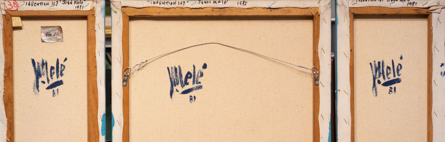 Acrílico sobre tela. Tríptico. Titulado, firmado y fechado Juan Mele/81, al dorso. Mide: 71 x 104 cm. Ref.: Reproducido en el libro "Antología Juan Melé", Galería Van Eyck, 2009.