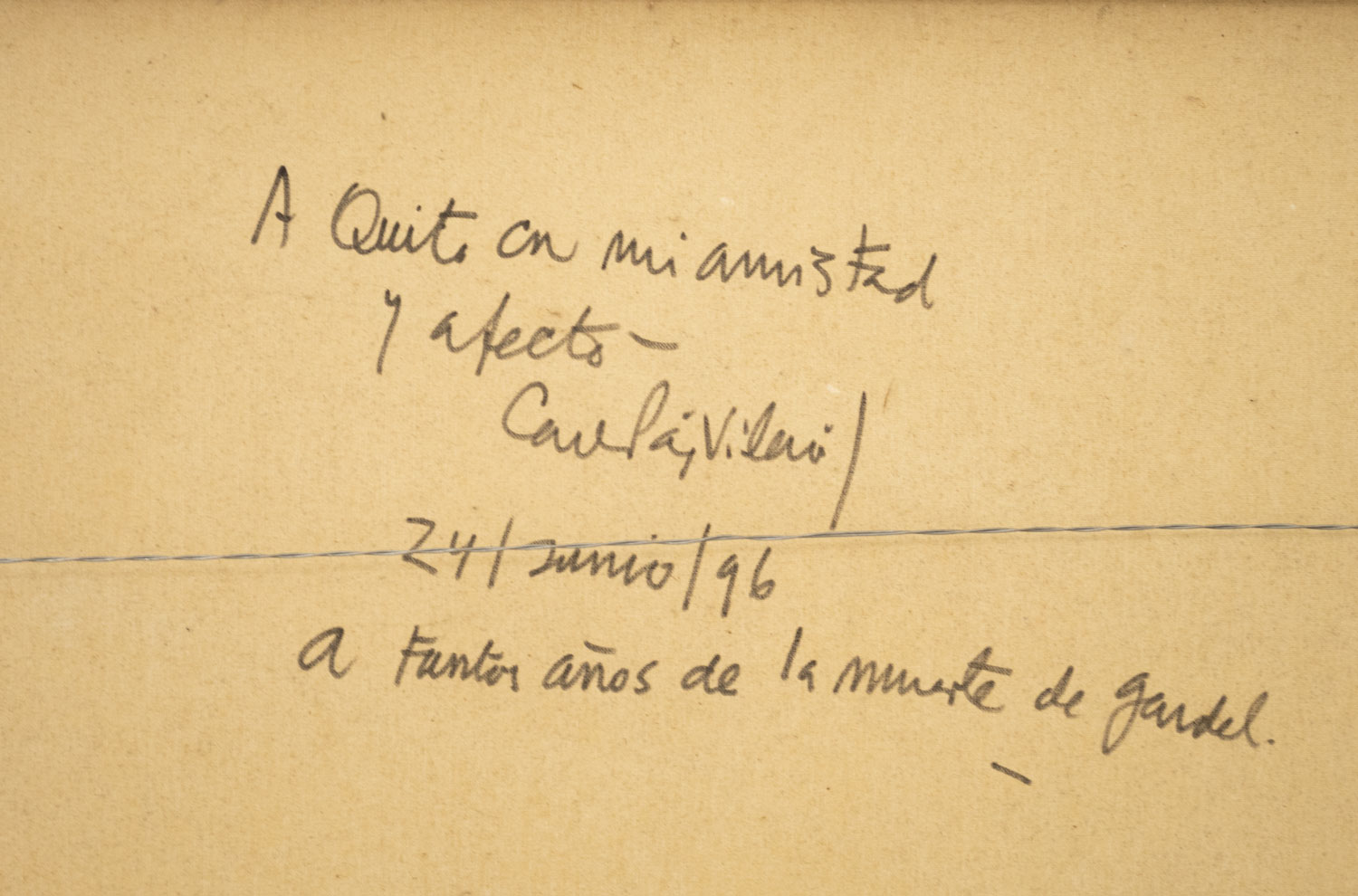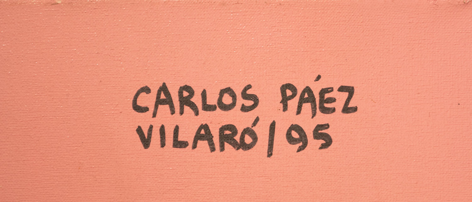 Óleo sobre tela. Firmado y fechado Carlos Páez Vilaró/95, arriba a la derecha. Mide: 150 x 150 cm. Ref.: Al dorso, dedicado, firmado y fechado "A Quito con amistad y afecto", Carlos Páez Vilaró, 24/junio/96, "A tantos años de la muerte de Gardel". Etiqueta del artista.