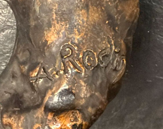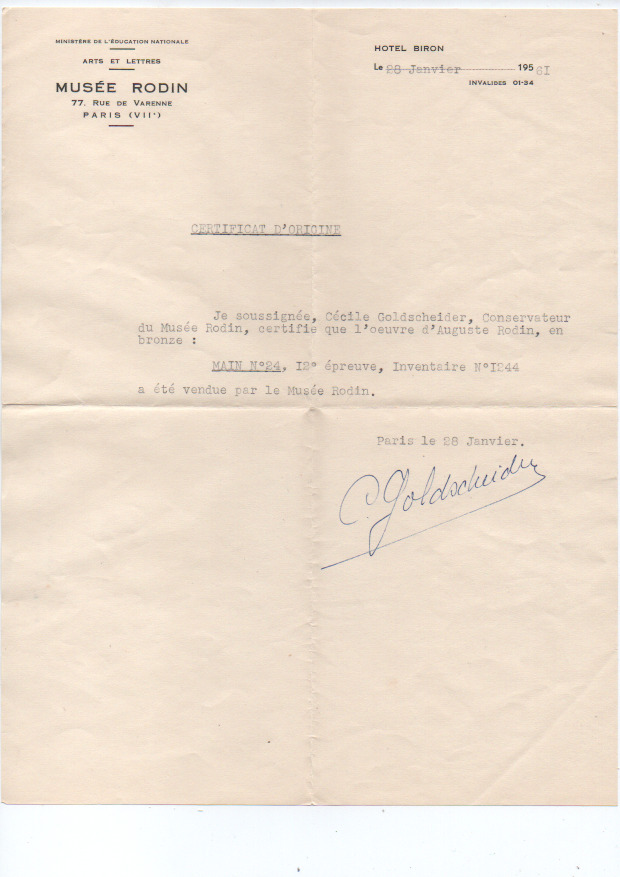 Escultura en bronce. Firmada A. Rodin, en la muñeca. Mide: 6 x 12 x 6 cm. Ref.: Sello de fundición George Rudier, París, al dorso. Certificado de autenticidad extendido por Cécile Goldscheider, conservadora del Museo Rodin, París, inventariada N° 1244 y vendida por el mismo Museo con fecha 28 de enero de 1961.